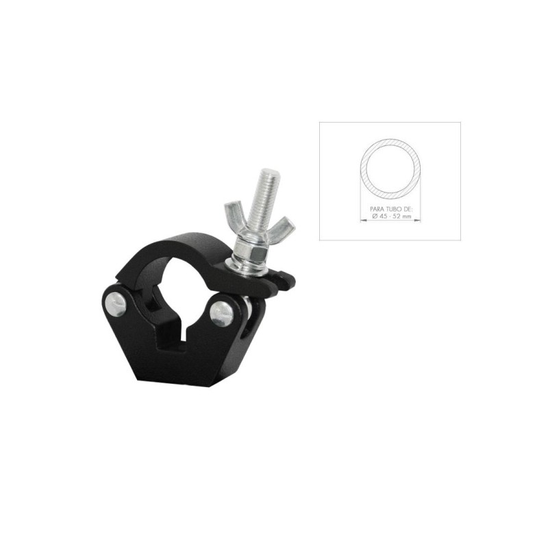 Abrazadera para tubos de Ø 45-52 mm. WLL: 500 kgFabricada en aluminio. Color negroRef. ABZ-29/N Abrazadera de aluminio para cargas de hasta 500 kg. Diseñada para una fijación segura a trusses / tubos con diámetro externo desde 45 mm a 52 mm. Doble sistema de fijación (de cierre), mediante tuerca y palomilla, la convierten en la abrazadera necesaria para los montajes más exigentes, eventos, teatros, actuaciones en vivo… donde la seguridad es un factor determinante. Destaca el tamaño más estrecho frente a la abrazadera ref. ABZ-24, lo que la hace más versátil para instalaciones donde se requiere la instalación de grandes cargas, pero el espacio para colocación de la abrazadera es reducido. Esta abrazadera polivalente se utiliza en múltiples sectores: eventos, construcción, etc. Combina fuerza y durabilidad con un alto grado de seguridad. Nuestra abrazadera ref. ABZ-29/N se puede utilizar para otro tipo de fijaciones simplemente añadiendo un tornillo-terminal, una argolla o una segunda abrazadera (convirtiéndola de esta manera en una abrazadera doble giratoria). ESPECIFICACIONES ABZ-29/N- Carga Máxima: 500 kg- Para tubos con diámetros: de 45 a 52 mm- Ancho: 30 mm- Tornillo de sujeción: Agujero de M12- Material: Aluminio- Color: Negro- Peso Neto: 0,40 kg