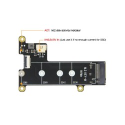 Descripción General El shield X1001 V1.1 es una placa periférica PCIe para discos SSD NVMe, M.2, para La Raspberry Pi 5 que utiliza la nueva interfaz PCIE para utilizar los SSD NVME M.2 para transferencias de datos rápidas y arranque ultrarrápido. La corriente máxima para el conector PCIe es 1A, y el voltaje es 5V. El hardware X1001 no tiene límite en la capacidad del SSD NVME, que depende del sistema operativo Raspberry Pi. Características - Diseño minimalista, fácil de instalar- Compatible con otros protectores HAT- FFC tiene solo 30mm de longitud- Admite la instalación de refrigeradores activos oficiales- Con indicadores LED M.2 SSD ACT- Soporta SSD NVMe M.2 de 2230/2242/2260/2280- Puede alimentar el escudo X1001 directamente desde la cinta FFC PCIe (proporcionando un máximo de 5W de potencia continua)- Integrado con el conector de alimentación XH2.54 de 5V, solo úselo si está utilizando un SSD de gran capacidad si la corriente no es suficiente. Cómo encender Puede alimentar el escudo X1001 directamente desde la cinta FFC PCIe (proporcionando un máximo de 5W de potencia continua) Lista de incompatibilidades de SSD NVMe: Recomendamos evitar las siguientes Unidades SSD NVMe que están equipadas con controlador Phison debido a su probada incompatibilidad: - Serie WD Blue SN550/SN580- Serie WD Green SN350- Serie WD Black SN850- Otros controladores NVMe SSD equipados con el mismo controlador Phison
