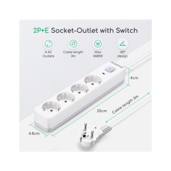 Aigostar Regleta Enchufes, Alargador Enchufe de 4 Enchufes con Interruptor, Cable de 3 Metros, BlancoMarca AigostarColor 3m CableTotal de tomas de corriente 4Tensión 2.5E+2 VoltiosFunción especial Interruptor de encendido y apagadoDimensiones del producto 25l. x 4,8an. centímetrosUsos recomendados para el producto Uso doméstico, oficina, eventos al aire libreForma RectánguloCorriente del adaptador de CA 16 AmperiosAmperaje 16 AmperiosInterruptor Conveniente - Este enchufe multiple tiene un interruptor muy conveniente, ya no tiene que enchufar o desenchufar el cable de alimentación cada vez con dificultad, también puede ahorrar más electricidad.La regleta enchufes tiene una luz rojo suave Indicadora. El brillo suave no te molestará cuando duermas.Protección Independiente - Cada enchufe, dispone de un dispositivo de protección infantil independiente, lo que es totalmente seguro para los niños y evita accidentes y riesgos de descarga eléctrica. Al cuidar la seguridad de su familia, también puede evitar que objetos extraños entren en la toma de corriente.Enchufes Colocados en 45º - Con enchufes colocados en un ángulo de 45°, evitando la interferencia entre las tomas de corriente. La longitud del cable de alimentación es de 3 m de largo, esto nos da mucha más flexibilidad.Agujeros Para Montaje en Pared - Los 2 orificios ranurados en la parte posterior también le permiten colgarlo de manera segura en varios lugares: pared, bancos de trabajo, escritorio, debajo de los mostradores y más. lo que ahorra espacio en el escritorio y brinda comodidad para cargar.Materiales de calidad - Material duradero,para asegurar su resistencia al calor.Gracias a su circuito de cobre,admite el uso de productos de potencia hasta los 3680W.una gama más amplia de aplicaciones.Marca: AigostarFabricante: AigostarModelo: HU-XI-201Dimensiones del producto: 25 x 4,8 x 0,03 cm, 540 gNúmero de modelo del producto: HU-XI-201Número de producto: HU-XI-201Otras características: Interruptor de encendido y apagadoNúmero de productos: 1Voltaje: 2.5E+2 VoltiosPotencia eléctrica: 3680 vatiosNúmero de puertos: 4Peso del producto: 540 gMateriales DuraderosHilo de cobre de tres núcleos de alta calidad con gran capacidad conductiva, durabilidad y vida útil.Protección IndependienteCada enchufe, dispone de un dispositivo de protección infantil independiente,evita accidentes y riesgos de descarga eléctrica.Bipolar InterruptorRegleta enchufe múltiple para el uso en interiores con un interruptor de iluminado para encendido y apagado todas las tomas de corriente.Exterior IgnífugoLa carcasa exterior de la regleta mantiene los componentes internos seguros en caso de emergencias.