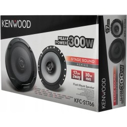 Pareja de altavoces amplia gama de autorradio. • Fabricante: Kenwood  • Modelo: KFC-S1766  • Tipo: Altavoces coaxiales de 2 vías  • Tamaño: 6.5" (16.5 cm)  • Potencia RMS: 30W  • Potencia máxima: 300W  • Impedancia: 4ohm  • Sensibilidad: 92dB/W/m  • Respuesta de frecuencia: 30Hz - 22kHz  • Profundidad de montaje: 43.2mm  • Material del cono: Polipropileno reforzado  • Tweeter: 1" (2.5 cm) de cúpula balanceada  • Imán: Ferrita  • Rejillas incluidas: Sí  • Peso unitario: Aproximadamente 500gr