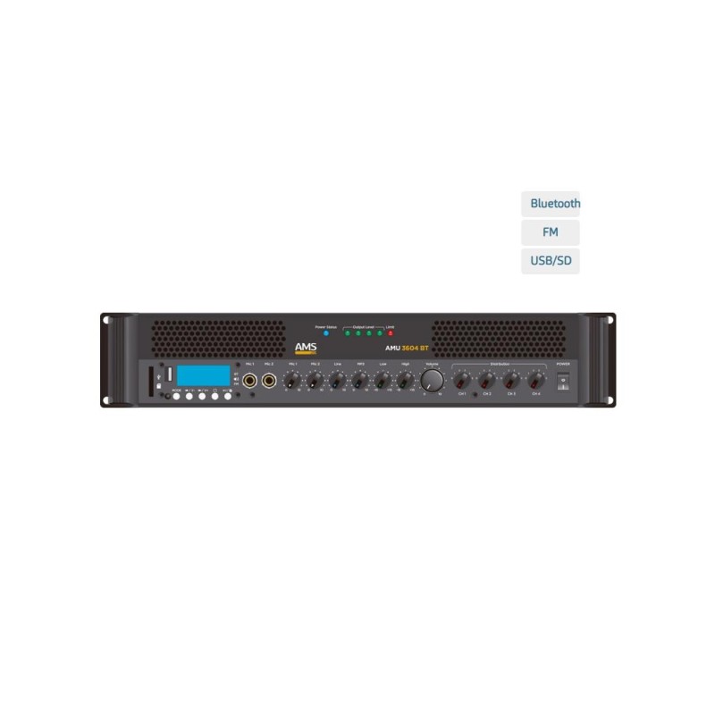 AMU 3604 BT es un mezclador/amplificador que puede operar tanto en baja impedancia (8-16 Ohm) como L100V. Incluye 3 canales de entrada (1AUX + 2 MIC), siendo una de las entradas MIC (MIC 1) con prioridad. Incorpora una interfaz USB para archivos de audio externos, así como conectividad Bluetooth, siendo posible enviar archivos de audio desde un smartphone o dispositivo similar. La pantalla muestra toda la información de pista, modo de funcionamiento, nivel de volumen, número de pista o tiempo transcurrido.