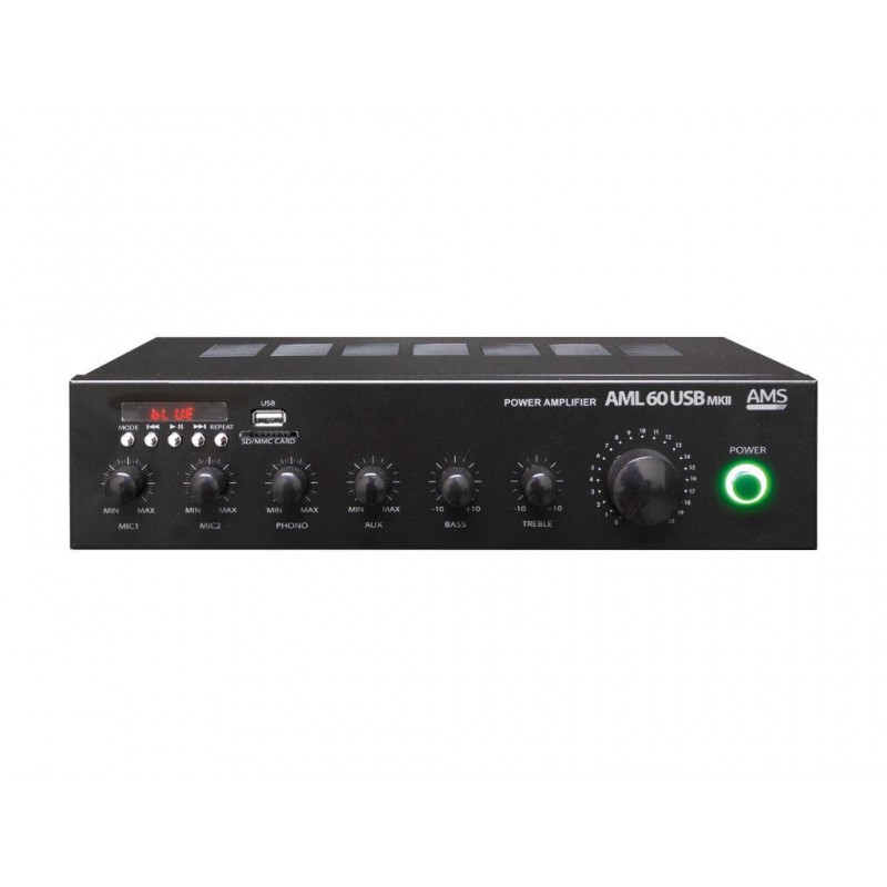 AML 60 USB MKII es un mezclador/amplificador de instalación que puede operar tanto en baja impedancia (4/8 Ohm) como línea de 70/100V. Incluye 4 fuentes de entrada (1 AUX + 1 PHONO + 2 MIC), siendo una de las entradas MIC (MIC 1) con prioridad. Incorpora una interfaz USB/SD para archivos de audio externos, y conectividad Bluetooth y radio FM. El amplificador incluye 2 controles de tono y ganancia individual de cada entrada. También es posible conectar el dispositivo a alimentación de emergencia (DC 12-24V). El control de las fuentes digitales puede realizarse a través del mando remoto incorporado. Mezclador/amplificador de instalación. Funcionamiento a baja impedancia (4-8?) y línea 70/100V. Entradas: 1 AUX + 1 PHONO + 2 MIC. Entrada Mic 1 con función de prioridad. Conectividad Bluetooth. Radio FM. Interfaz USB/SD. Mando remoto. 2 controles de tono.