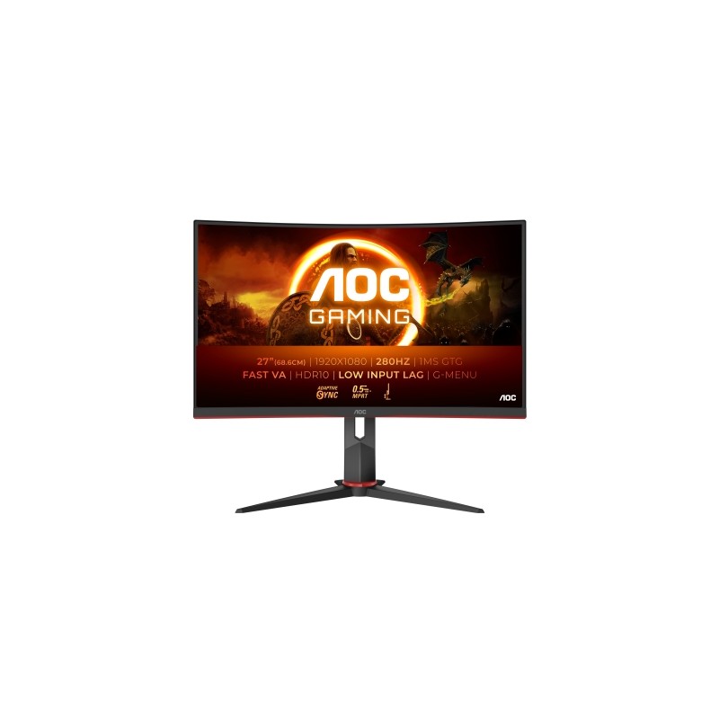 FHD Fast VA Curved de 27\'\' con frecuencia de actualización de 240Hz para aventuras de juego avanzadasJuega a lo grande con el AOC C27G2Z3/BK. Con una pantalla curva de 27\'\' y una frecuencia de 240Hz , este monitor lleva tu experiencia de juego al siguiente nivel. Con un tiempo de respuesta GtG de hasta 1 ms y MPRT de 0,5 ms, disfrutarás de un juego fluido que te dará ventaja. La tecnología Adaptive Sync garantiza imágenes sin rasgados y la compatibilidad con HDR10 y el bajo retardo garantizan gráficos nítidos y máxima rapidez. También puedes ajustar la posición de juego perfecta. Equípate con esta poderosa herramienta y prepárate para conquistar el juego.