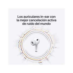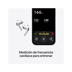 Apple AirPods Pro 3 Auriculares inalámbricos con cancelación Activa de Ruido, medición de frecuencia Cardiaca, Auriculares Bluetooth, Audio Espacial, Sonido de Alta fidelidad y Carga por USB-CMarca AppleColor BlancoColocación en las orejas IntrauralesFactor de forma IntrauralesNombre del modelo AirPods Pro 3Tecnología de conectividad InalámbricoComponentes incluidos AirPods Pro 3, Almohadillas de silicona, Estuche de carga MagSafe (USB‐C) con altavoz y enganche para correaAirPods Pro 3, Almohadillas de silicona, Estuche de carga MagSafe (USB‐C) con altavoz y enganche para correaUsos específicos del producto Condición física, Entretenimiento, ViajeNúmero de productos 1LOS AURICULARES IN-EAR CON LA MEJOR CANCELACIÓN ACTIVA DE RUIDO DEL MUNDO — Reduce hasta el doble de ruido de fondo que los AirPods Pro 2* para que te sumerjas en el momento.*RENDIMIENTO ACÚSTICO REVOLUCIONARIO — Disfruta de un audio tridimensional sublime con los AirPods Pro 3. Su nueva arquitectura acústica ofrece graves más profundos, una impresionante nitidez vocal y una definición asombrosa en los matices de cada instrumento.MEDICIÓN DE FRECUENCIA CARDIACA — Controla tus pulsaciones y las calorías que quemas en hasta 50 tipos de entreno.* Con el iPhone, puedes acceder al anillo Movimiento, el número de pasos y mucho más.MAYOR AUTONOMÍA — Hasta 8 horas de reproducción de audio con la cancelación activa de ruido en una sola carga.ENCAJE PERFECTO — Las nuevas almohadillas en cinco tamaños ofrecen un ajuste personalizado y mejor rendimiento acústico en todos los modelos.*SALUD AUDITIVA — La prestación Protección Auditiva activa ayuda a reducir tu exposición a niveles perjudiciales de sonido ambiental.*AUDIO PERSONALIZADO — La ecualización adaptativa de última generación diseña un perfil sonoro según la forma particular de tus orejas.* Además, los micrófonos orientados hacia dentro miden lo que escuchas para hacer ajustes en tiempo real.SIENTE LA MAGIA — Cambio Automático te permite pasar de un dispositivo Apple a otro sin interrupciones.* Y con Audio Compartido puedes disfrutar de la misma canción o serie en dos pares de AirPods desde tu iPhone, iPad o Apple TV.** AVISOS LEGALES — Esto es un resumen de las principales prestaciones del producto.