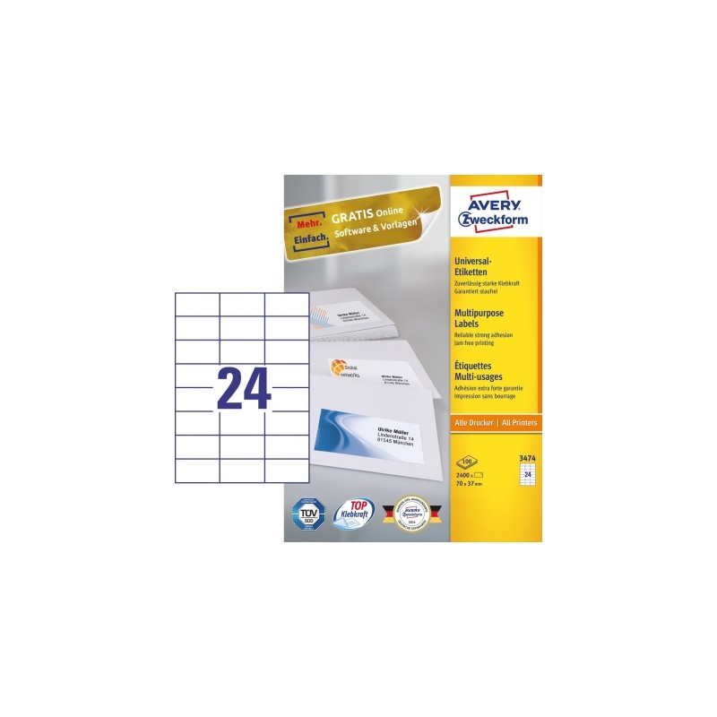 Características - Rectángulo Permanente A4 Blanco - Material: Papel - Imprimible - Tecnología de impresión: Laser/Inyección de tinta - 2400 pieza(s) Especificaciones Características Color del producto: Blanco Forma: Rectángulo Tipo de adhesivo: Permanente Tamaño de etiqueta: 70 x 37 mm Formato: A4 Material: Papel Imprimible: Si Tecnología de impresión: Laser/Inyección de tinta Etiquetas por hoja: 24 pieza(s) Hojas de medios por paquete: 100 hojas Certificación: TÜV SÜD, FSC Contenido del embalaje Etiquetas por paquete: 2400 pieza(s) Otras características No contiene: Cloro
