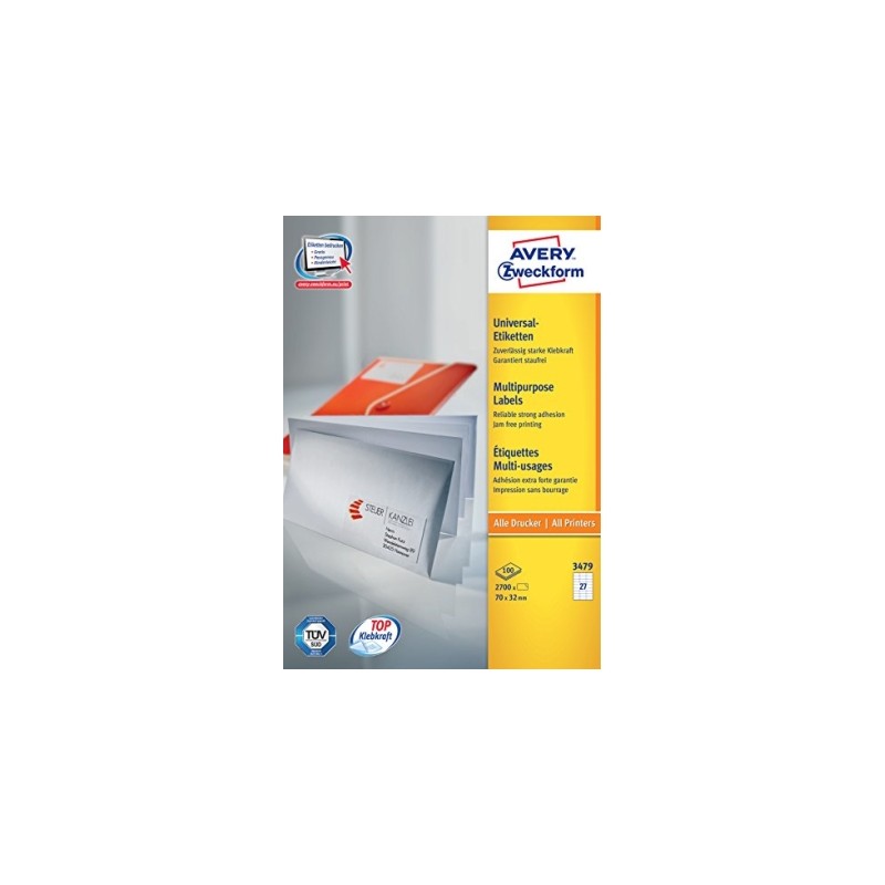 Características - Etiqueta para impresora autoadhesiva - A4 Utilizar con: Universal - Rectángulo Blanco - Material: Papel - Tecnología de impresión: Laser/Inyección de tinta - Tipo de adhesivo: Permanente - Etiquetas por paquete: 2700 pieza(s) Especificaciones Características Color del producto: Blanco Tipo de etiqueta: Etiqueta para impresora autoadhesiva Formato: A4 Material: Papel Tecnología de impresión: Laser/Inyección de tinta Tipo de adhesivo: Permanente Utilizar con: Universal Forma: Rectángulo Certificación: FSC Sostenibilidad No contiene: Cloro, PVC Peso y dimensiones Anchura de etiqueta: 7 cm Altura de etiqueta: 3,2 cm Tamaño de etiqueta: 70 x 32 mm Contenido del embalaje Etiquetas por paquete: 2700 pieza(s) Hojas de medios por paquete: 100 hojas