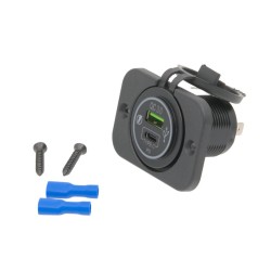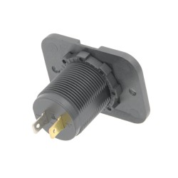 Base de alimentación para fijar a panel mediante roscado o atornillado, con conexión de alimentación mediante faston de 6.35 mm. Compatible con voltajes de alimentación DC 12V. Caracteristicas:- Potencia total: 36W- Voltaje de entrada: 12V- Voltaje de salida: 5V/3A, 9V/2A, 12V/1.5A- Referencia IP: IP65 Incluye panel de montaje, tapón antiagua, tornillos y faston para cables de 1.5-2.5 mm.
