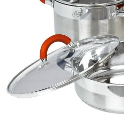 • Juego de 8 pcs.• Incluye cazo de 16 cm, olla de 18, 22 cm y cazuela de 24 cm.• Fabricada en acero inoxidable de alta calidad 18/10.• 4 Tapas de cristal.• Mangos y asas recubiertos de silicona.• Compatibles con cocinas de gas, vitrocerámica, inducción y cocinas eléctricas.• Aptas para lavavajillas.