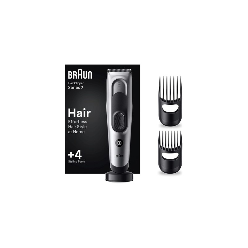 Braun Serie 7 Maquina Cortar Pelo, Cortadora de Pelo, Máquina de afeitar, Cortapelos Para Hombres con 17 ajustes de longitud, bloqueo SafeLock con memoria, HC7390, GrisUsos recomendados para el producto CabelloColor NegroTipo de pelo TodosPeso del producto 416 GramosMarca BraunFuente de alimentación Cable eléctricoMaterial Plástico Acero aleadoFunción especial Desmontable, Recargable, ErgonómicoMaterial de la cuchilla Acero aleadoAudiencia destinataria HombresCorta y perfila tu pelo sin esfuerzo: las láminas ultraafiladas permiten un recorte de pelo fácil y rápido. Sin importar la longitud o el grosor17 longitudes: desde 2 peines o sin peine. Memoria SafetyLock que bloquea el último ajuste usado para recortar el pelo de forma sencilla desde casaDiseñada para durar: el cortapelos inalámbrico incluye una lámina afilada de por vida y una batería Ni-MH con 50 minutos de autonomíaHecho para la comodidad: el mango ergonómico con agarre de goma es cómodo, y el dispositivo puede limpiarse fácilmente con agua corrienteAccesorios adicionales: esta recortadora de pelo para hombre incluye una base de carga y una funda. Un regalo que le va a encantarConsigue fácilmente el estilo que deseas desde casa con el cortapelos de Braun. Las láminas ultraafiladas facilitan el corte de cualquier longitud o grosor de pelo. Con 2 peines, 17 ajustes de longitud y memoria SafetyLock para que tu último ajuste se quede bloqueado. Dispone de una potente batería Ni-MH, 50 minutos de autonomía y un diseño lavable.Contenido de la caja: 1 cortapelos, 1 peine pequeño (3-24 mm), 1 peine grande (14-35 mm), 1 base de carga, 1 estuche,1 cepillito de limpieza.1. Asegúrate de que la recortadora de pelo esté limpia y completamente cargada. 2. Elige el ajuste de longitud deseado. 3. Enciende la recortadora de pelo. 4. Recorta tu cabello siguiendo la dirección de su crecimiento. 5. Enjuaga la recortadora con agua corriente y sécala después de su uso.