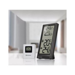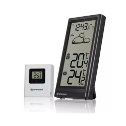 Estación meteorológica BRESSER Meteo TempEsta estación meteorológica inalámbrica le muestra no solo los valores actuales, sino también la tendencia meteorológica para las próximas horas en la pantalla claramente diseñada.Estación por señal radiocontrolada con visualización de la previsión meteorológicaReloj con señal radiocontrolada DCF, visualización de la fecha, previsión meteorológicaTemperatura (interior y exterior)Tamaño del producto: 157x82x20mm, peso: 154gContenido de la entrega: estación meteorológica, sensor exterior, instruccionesFrecuencia MHz 433, distancia de hasta 80 mPie abatible y soporte para la paredPrecisa pilas: 2xAAA (estación meteorológica) + 2xAAA (sensor)Información sobre el producto Estación meteorológica BRESSER Meteo TempLa estación meteorológica BRESSER Meteo Temp le convencerá con un pantalla diseñada para su fácil lectura, en la que podrá leer la hora siempre actualizada, gracias a la señal radiocontrolada DCF, así como la fecha actual. Además la estación dispone de informaciones relativas a la temperatura interior y exterior. Los valores para el exterior son proporcionados por un sensor exterior incluido en la entrega. Gracias al gráfico, podrá observar la previsión meteorológica para las próximas horas. El diseno de lineas rectas puede usarse en cualquier interior, independiente de su diseño. Su diseño sin botones visibles le otorga un toque elegante.PROPIEDADESHora y fecha por señal radiocontrolada DCF (puede escoger entre formato de 12- 24 horas)Temperatura (°C) interior y exteriorVisualización gráfica de la previsión meteorológicaGran pantalla distribuida para su fácil lectura1 sensor exterior para temperatura conectable (1 incluido)Pie abatible y soporte para la paredPrecisa pilas: 2xAAA (estación meteorológica) + 2xAAA (sensor) (no incluido)CONTENIDO DE LA ENTREGAEstación meteorológicaSensor exteriorInstrucciones de usoCaracterísticas: Previsión meteorológica, Señal de tiempo DCFColor: negroFunción de medición: Temperatura exterior, Temperatura interiorMaterial: PlásticoMaterial de carcasa: PlásticoTipo: AAATipo de montaje: Soporte, soporte de pared