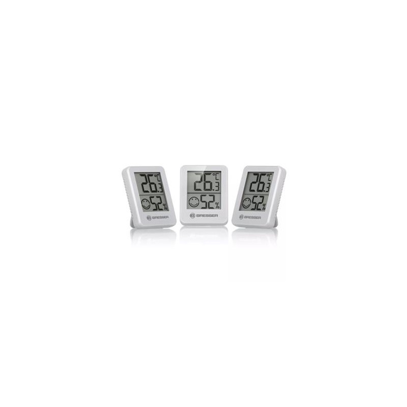 BRESSER ClimaTemp Hygro indicador de 3 piezas3 indicadores de humedad para controlar el clima interior3 indicadores Hygro para controlar la temperatura ambienteMedición de la temperatura ambiente y la humedad en el aireVisualización simbólica del nivel de la temperatura ambienteNúmero de producto: 7000010GYE000EAN: 4007922035475WEEE-Reg.-Nr.: DE 34323861Información sobre el producto BRESSER ClimaTemp Hygro indicador de 3 piezasUna temperatura ambiente ideal no solo tiene efectos positivos para nuestro bienestar, sino que también es beneficiosa para nuestra salud. Los dos valores decisivos que determinan la temperatura ambiente son la temperatura y la humedad relativa.Así pues, la humedad demasiado baja no solo causa ardor en los ojos y labios agrietados. También provoca a una mucosa nasal seca, que entonces ya no es capaz de proporcionar protección contra los patógenos inhalados.Con el práctico ClimaTemp Hygro Indicador de 3 piezas usted tiene el control sobre la temperatura ambiente en todas las habitaciones en las que pase gran parte de su tiempo (por ejemplo, el salón, el dormitorio o la habitación de los niños).Además de los valores concretos de la temperatura ambiente (C°) y la humedad en el aire (%) también contiene un indicador que muestra de forma simbólica si esto valores se encuentran entre el intervalo de los valores recomendados o si hay que tomar medidas.CARACTERÍSTICASVisualización de la temperatura en C° Humedad en el aireIndicador simbólico de la temperatura ambienteMontaje en mesa o paredINCLUYE3x Thermo-/Hygro-Station3 pilas CR2032Manual de usoCaracterísticas: Indicador de clima interiorColor: blanco, gris, negroFunción de medición: Humedad (interior), Temperatura interiorMaterial: PlásticoMaterial de carcasa: PlásticoTipo: CR2032Tipo de montaje: Imán, Soporte, soporte de pared