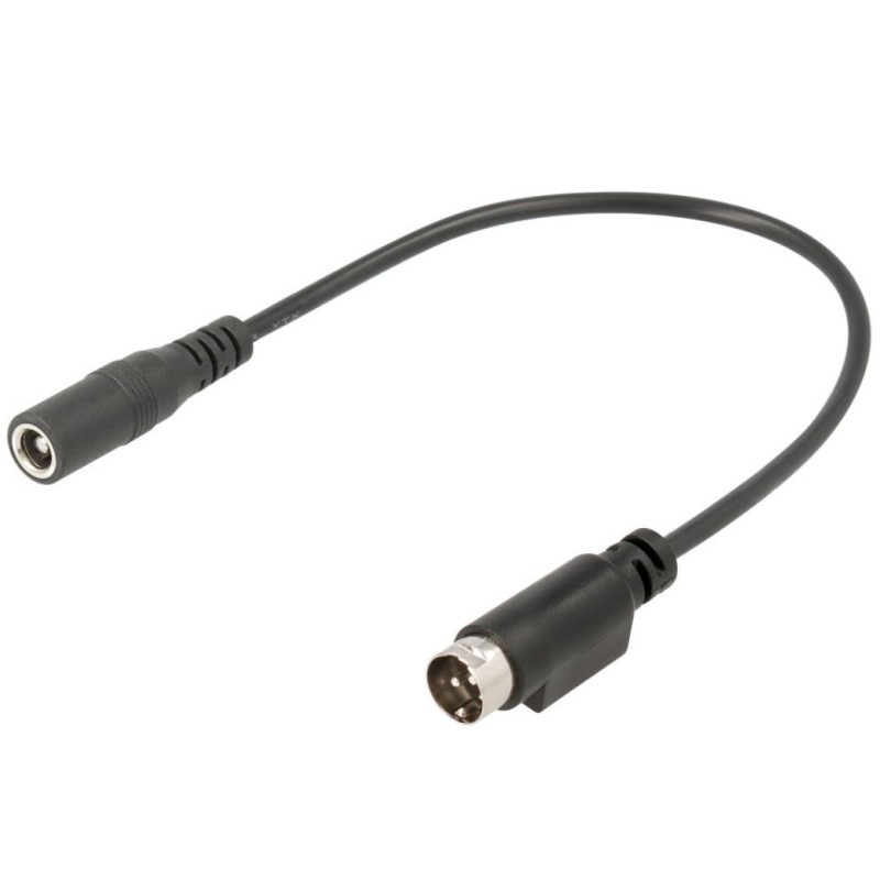 Conexión de salida: Conector Mini Din macho de 3 pines gruesos. Conexión de entrada: DC 5,5x2,1mm. Color: Negro. Longitud Cable: 0,2mts.