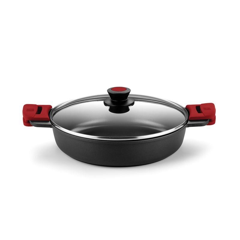 • Fabricada en aluminio fundido muy resistente a la deformación.• Revestimiento antiadherente Teflón Classic 100% libre de PFOA.• Compatible con todas las fuentes de calor incluida la inducción. • Tiene un excelente reparto de la temperatura para una cocción perfecta de todas nuestras recetas.• Incluye tapa de cristal con pomo termo resistente y dos asas de silicona en color rojo.• Apta para lavavajillas.• Cuerpo apto para horno hasta 220ºC sin asas de silicona.• Capacidad: 2,3 litros.• Color: negro y rojo.• Espesor base: 5,5 mm.• Diámetro: 24 cm.• Diámetro base inducción: 18.6 cm.• Medidas: 12.85 x 25.5 x 22.8 cm.• Peso: 1500 gr.