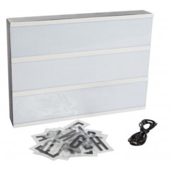 Caja de luz Led blanca 30x22x4.3 con conexión USB con letras y símbolos Instalación: se puede colgar de la pared o utilizar obremesa.alimentación: 3 x pila AA (no incl.) o cable mini USB 5 VDC 500 mA (1 m, incl.) color del LED: blanco