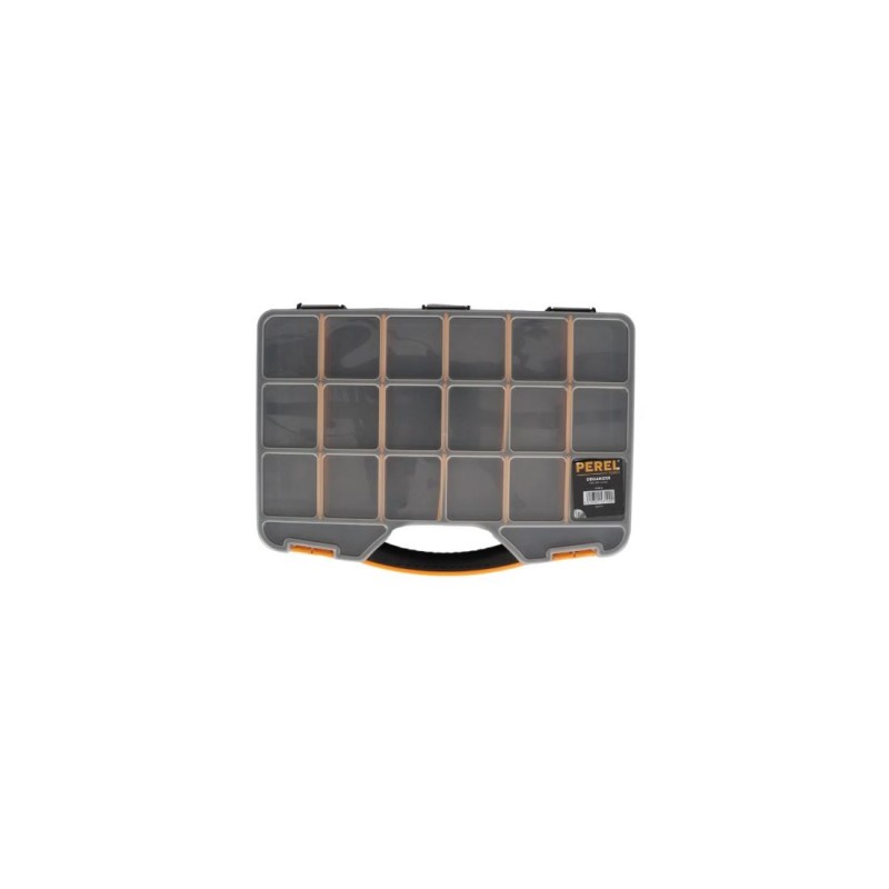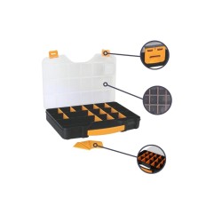 Caja de almacenamiento, máx. 20 compartimentos, 16 separadores, transparente, cubierta apilable, 415 x 286 x 61 mm, negro/naranja
