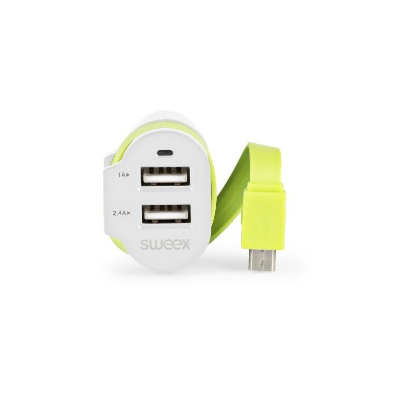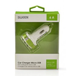 Cargador de Coche 3-Salidas 6 A Sweex , 2 salidas USB+1 salida Micro-Usb.Cuenta con un cable Micro USB integrado de 26 cm con diseño plano y ofrece un almacenamiento inteligente. Olvídese por completo de los enredos y la desorganización de cables, y ahorre tiempo y molestias. Además, el cargador para el coche admite la carga simultánea de tres dispositivos, como cámaras, tablets y sistemas de navegación, con una corriente máxima de 6 A (1x Micro USB y 2x USB). Ya no tendrá que esperar a que el smartphone de otro pasajero se cargue para cargar el suyo.