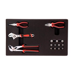 • Carro + cajonera con herramientas.• 5 pcs. brocas helicoidales HSS (4-5-6-8-9-10 mm).• 5 pcs. brocas para madera (4-5-6-8-9-10 mm).• 5 pcs. brocas para hormigón (4-5-6-8-9-10 mm).• 1 Martillo de oreja 300 gr.• 10 pcs (puntas 50 mm).• 80 pcs (puntas 25 mm).• 6 pcs (destornilladores aislados 3x75, 4x100, 5.5x125(-), PH0x75,PH1x100,PH2X100(+).• 1 Mango giratorio 1/4´´.• 1 Destornillador chicharra.• 1 Medidor de voltaje.• 1 Nivel.• 1 Cinta aislante.• 1 Flexómetro.• 1 Arco de sierra 6´´.• 1 Cutter.• 130 pcs Fijación.• 13 pcs Vasos 1/4¨(4-5-5.5-6-7-8-9-10-11-12-13 mm).• 1 Alicate universal 6´´.• 1 Alicate de punta larga 6´´.• 1 Alicate pico loro 10´´.• 1 Llave ajustable 8´´.• 1 Carro.• 1 Cajonera.• Medidas: 62x33x100 cm (Ancho x Profundidad x Alto)• Medida cajonera: 60x26x30 cm (Ancho x Profundidad x Alto)• Medida carro: 62x33x74 cm (Ancho x Profundidad x Alto)