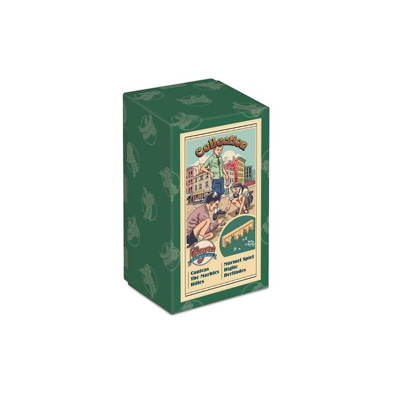 COMPONENTES: 20 canicas de cristal, 1 canica de madera, bolsa de tela, caja de cartón estilo retro. EDAD: +8 NIVEL: 8 años, primaria.