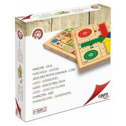 Cayro - Parchís y Oca - + 5 Años - Modelo de Madera - Juego de Mesa de Niños y Adultos - con Tablero Reversible - Diversión Familiar - 2 a 4 JugadoresRango de edad (descripción) 4 a 99Número de jugadores 2Marca CayroTema NúmeroMaterial Bois massifColor SurtidoComponentes incluidos juegoInformación del paquete CajaDimensiones del producto 28l. x 18an. centímetrosFunción especial Jugado de mesa de dos ladosPARCHÍS Y OCA: Este imprescindible juego de mesa doble es garantía asegurada de diversión para toda tu familia y amigos. Disfruta de increíbles tardes jugando con los tuyos, fortaleciendo vuestros vínculos emocionales a la vez que lo pasáis genial.CÓMO JUGAR: Podéis jugar mínimo 2 personas y máximo 4. Se reparten los colores y comienza la diversión al instante mientras va avanzando el juego. Sé el primero en llegar a la meta en la oca o en colocar la ficha en el centro del parchís.ESPECIFICACIONES TÉCNICAS: El juego incluye 1 tablero reversible (29 x 29 cm) de madera. El conjunto de fichas ha sido elaborado con madera natural en 4 colores diferentes y está formado por: 4 cubiletes, 16 piezas planas circulares y 4 dados.PLAY FOR CHANGE: Es una iniciativa propia de Cayro que otorga una distinción especial a los productos elaborados de forma consciente con materiales obtenidos responsablemente, como la cera orgánica de abeja, madera natural o plástico reciclado.INTELIGENCIAS MÚLTIPLES: Gracias al uso de este juego, podrás estimular una serie de aspectos psicomotrices básicos: Habilidades intrapersonales e interpersonales, lógica matemática y coordinación visual-espacial.Dimensiones del producto 6 x 30,5 x 30,5 cm, 980 gPilas 1 A (Tipo de pila necesaria)Edad recomendada por el fabricante 8 años y másValor educativo Creatividad, Habilidad Cognitiva, Habilidad Manual, Razonamiento, Resolución de problemasIdioma: Español, InglésNúmero de modelo 632Número de jugadores 2Número de piezas 1Tipo(s) de material Bois massifColor SurtidoPeso del producto 980 g