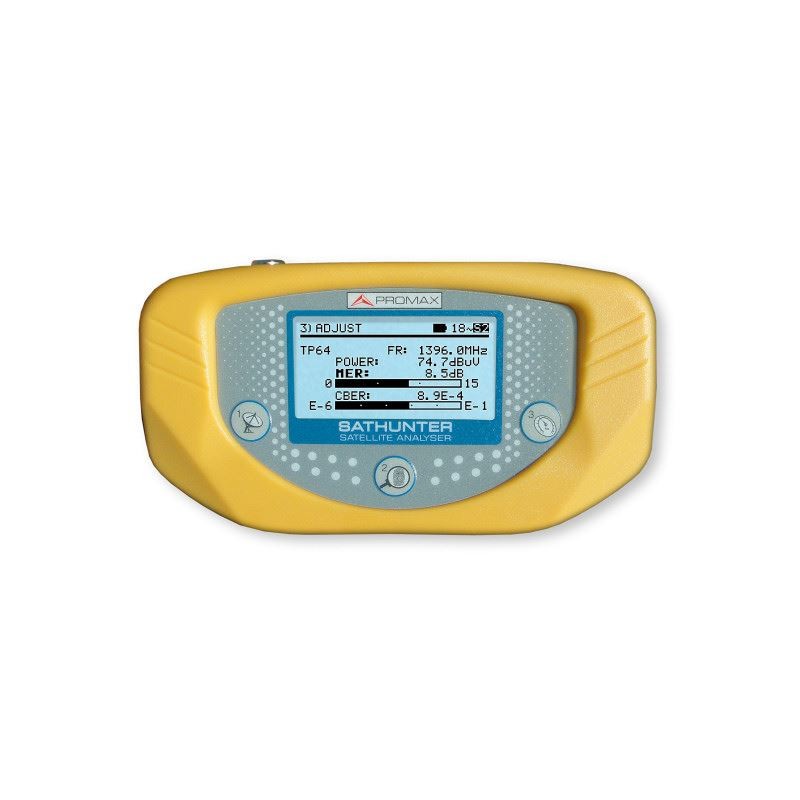 Promax - Cazador de Satélites SATHUNTER. Instrumento diseñado para la instalación de sistemas de recepción satélite (DVB-S/S2 y DSS). Es completamente automático y muy fácil de usar. Simplemente oriente la antena y el instrumento mostrará la identificación del satélite seleccionado cuando éste sea detectado. El instrumento efectúa una lectura de la información transmitida por el satélite mostrando en todo momento su posición orbital y la lista de servicios.