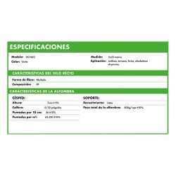 • Aplicaciones: jardines, terrazas, ferias, alrededores de piscina.• Fácil instalación.• Alta protección frente a los rayos UV.• Altura: 7 mm.• Calibre: 5/32 pulgadas.• Medida: 2X25 m.