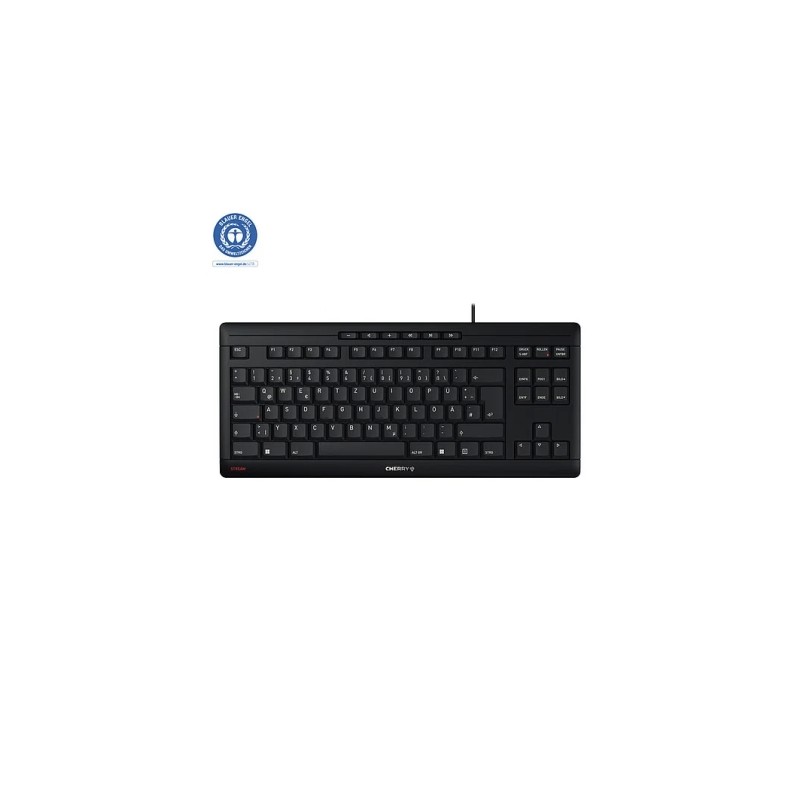 Para todos los amantes de los teclados silenciosos y con la inimitable sensación de tecleo del STREAM KEYBOARD, ahora hay una alternativa más pequeña y compacta: el STREAM KEYBOARD TKL. Aunque los dos son prácticamente idénticos, difieren de manera significativa en un aspecto: La versión TKL con cable posee el mismo teclado principal que el popular STREAM KEYBOARD y de lo único que se ha privado es el teclado numérico. Para muchos ámbitos de aplicación esta es una ventaja decisiva.Las similitudes entre los dos teclados con cable incluyen una importante característica del producto: La tecnología de tijera SX propia de CHERRY. Es el corazón de la gama STREAM y al mismo tiempo el requisito básico para que los usuarios exigentes que teclean con mucha frecuencia puedan trabajar de forma productiva. El resultado es un punto de presión perfecto que garantiza una ejecución precisa y una pulsación silenciosa.La versión TKL se diferencia de su hermano mayor en que su diseño reducido no incluye el teclado numérico. El STREAM KEYBOARD TKL es perfecto para todos aquellos que apenas utilizan el teclado numérico y que al mismo tiempo no desean prescindir de la disposición familiar del teclado principal. Con la versión compacta se ahorra espacio en el escritorio de la oficina y en casa y es posible concentrarse con mayor facilidad en lo esencial. En el sector industrial y gracias a sus dimensiones reducidas, este caballito de batalla es óptima para cajones de 19 pulgadas. Disponible como accesorio, la película protectora WetEx resulta ideal para entornos de trabajo más exigentes, ya que está especialmente adaptada a las dimensiones del teclado.Cualquiera que pase mucho tiempo todos los días delante de un escritorio sabe que una postura ergonómica es esencial como medida preventiva para el cuidado de la salud, ya que esta permite evitar la tensión y el dolor en la zona de la espalda, las manos, los brazos y el cuello. Por ello es muy positivo que las reducidas dimensiones de este pequeño teclado vengan acompañadas de ventajas ergonómicas decisivas. Para los diestros, el ratón y el teclado se encuentran más cerca. El brazo derecho no tiene que estar tan extendido, lo que corresponde a una postura de trabajo optimizada y contribuye a evitar posturas incorrectas. El Seguro Social Alemán de Accidentes (DGUV) confirma la teoría de que los teclados TKL favorecen una postura más natural y ergonómica.El sello de seguridad comprobada (GS por sus siglas en alemán) y la distinción «Ángel Azul» (Blauer Engel) aseguran un beneficio adicional para la salud. El sello GS tiene en cuenta todas las directivas y reglamentos europeos pertinentes en relación con la protección de la salud. Esto incluye, por ejemplo, que las letras sean claramente legibles en las teclas. Este es un requisito fundamental para trabajar sin fatiga.La etiqueta de protección del medio ambiente «Ángel Azul» constituye otro incentivo adicional para una compra responsable. Cualquiera que compre productos con este sello puede estar seguro de que en el proceso de desarrollo del producto se han implementado altos estándares en cuanto a propiedades medioambientales, de salud y de uso. Por cierto, el STREAM KEYBOARD TKL no contiene ningún material de embalaje de plástico.Además de las propiedades del producto ya mencionadas, el CHERRY STREAM TKL cuenta con muchas otras características interesantes. Una de ellas son los LED de estado de CAPS y SCROLL LOCK (bloqueo mayúsculas, números y desplazamiento). Al estar situados directamente en la tecla, la larga búsqueda de los LEDs de estado activados es cosa del pasado. Aunque esta característica solo suele estar presente en las gamas de precios más altas, ahora es estándar en casi todos los productos CHERRY. El teclado plano con cable funciona según el principio Plug&Play. Esto significa que está listo para su uso sin necesidad de instalar ningún controlador. Las 6 prácticas teclas adicionales son muy útiles en el día a día, ya que permiten controlar las aplicaciones multimedia con facilidad y sin tener que pulsar una tecla FN adicional. Si además desea añadir otras funciones adicionales a sus teclas, el software CHERRY KEYS es la solución. Este está disponible para su descarga gratuita en www.cherry.de.¿Pasa mucho tiempo frente a su PC y busca un teclado compacto sin teclado numérico? ¿También le da importancia a un alto nivel de calidad y quiere contribuir de manera positiva a su salud? Entonces el STREAM KEYBOARD TKL es el más adecuado para usted.