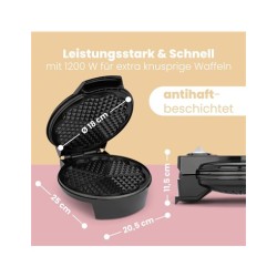 Clatronic WA 3491 - Gofrera máquina para hacer gofres en forma de corazón, plato 18 cm, placa antiadherente, termostato regulable, 1200 W, color negroFunción especial TermostatoColor NegroMaterial AcierMarca ClatronicDimensiones del producto 25f. x 21an. x 12al. centímetrosVataje 1200 vatiosPeso del producto 1300 GramosEstilo ModernoTensión 230.0Número de ajustes 2Gofrera compacta para elaborar 5 gofres crujientes con la típica forma de corazón y dibujo de panal de la serie fun cooking de clatronicTermostato ajustable de temperatura para controlar el nivel de tostado de los gofres, 2 lámparas de control temperatura y apagado/encendidoPlato de 18 cm con recubrimiento antiadherente de alta calidad para sacar con facilidad los gofres y obtener una fácil limpiezaCarcasa de tacto frío con asa especial para aislar el calor generado y evitar quemaduras. Dispositivo de seguridad contra sobrecalentamiento con certificado de fabricación CE y GSMáquina de hacer gofres ideal para acompañar con siropes de sabores, mermelada, nata o fruta, incluye receta para elaborar gofres de bizcochoMarca ‎ClatronicNúmero de modelo ‎WA3491-BKColor ‎NegroDimensiones del producto ‎25 x 21 x 12 cm, 1,3 kgPotencia ‎1200 vatiosVoltaje ‎230.0Material ‎AcierApagado automático ‎NoCaracterísticas especiales ‎TermostatoPeso del producto ‎1,3 kg