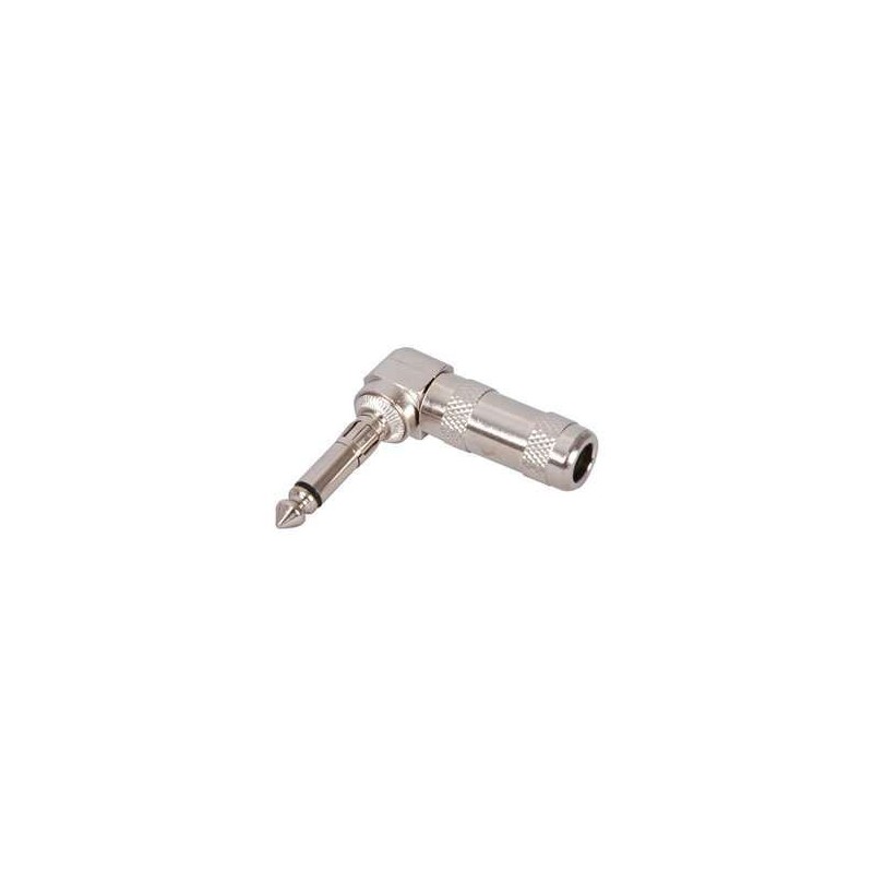 Conector Jack mono 6,3 mm macho aereo acodado. Cromado.