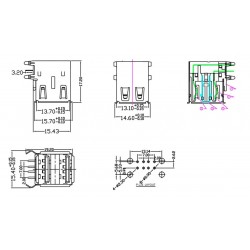 Conector USB doble tipo A hembra chasis para circuito impreso