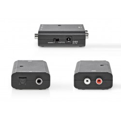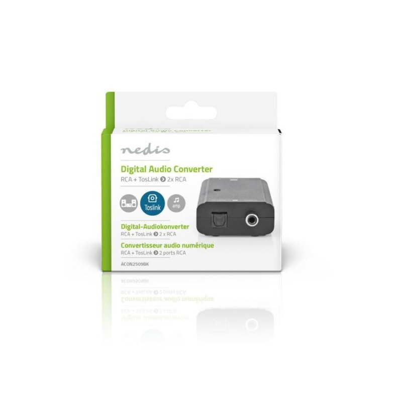 Convertidor de audio Digital o Coaxial TosLink SPDIF a Anaolgico RCA L-R de Nedis. Conversión unidireccional: convierte señales de audio digital TosLink o RCA en señales de audio estéreo analógicas.Incluye un cable de carga de CC a USB (adaptador no incluido) para facilitar la alimentación de este convertidor de audio digital.
