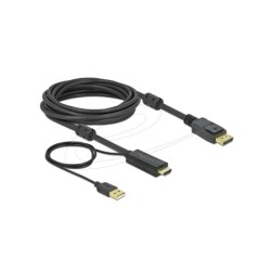 Delock Cable HDMI a DisplayPort 4K 30 Hz 5 mNúmero de elemento 85966Este cable de Delock permite la conexión entre dispositivos, por ejemplo, un monitor, con conector DisplayPort a una interfaz HDMI.Detalles tecnicosConectores:1 x HDMI-A macho1 x USB Tipo-A macho (fuente de alimentación) &gt,1 x DisplayPort machoDirección de señal: Entrada HDMI &gt, Salida DisplayPortConjunto de chips: STDP2600Especificación DisplayPort 1.2 y High Speed HDMIValor normalizado del cable: 28 AWGDiámetro del cable: aprox. 7,2 mmContactos bañados en oroTransferencia de señales de audio y vídeoResolución máxima 3840 x 2160 @ 30 Hz(depende del sistema y del hardware conectado)Admite pantallas 3D (1080p @ 120 Hz)2 x núcleo de ferritaColor: negroLongitud incluido conectores: aprox. 5 m