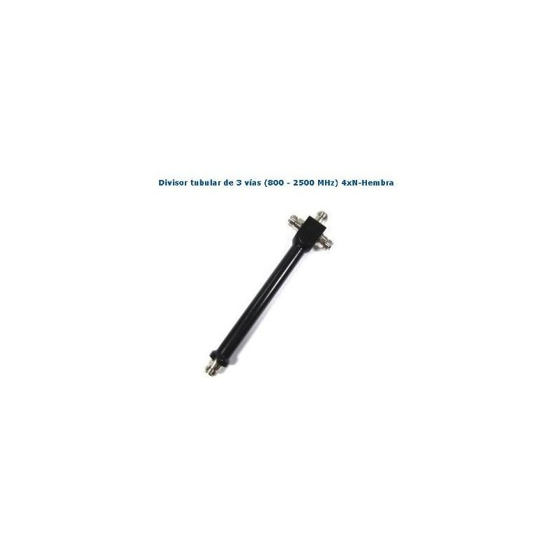 Divisor GSM 3 vias N-Hembra (800-2500Mhz) , Splitter 3 vias para rango de frecuencia 800-2500Mhz, con este despositivo podrá conectar 3 antenas a su repetidor GSM, para generar señal en 3 puntos o areas deseadas.Splitter, divisor, bifurcador o multiplicador en forma de tubo para conexiones de antenas que operan en la banda de los 800 MHz a los 2500 MHz. Modelo que dispone de 4 conectores y permite conectar 3 antenas a una misma electrónica de red inalámbrica, como por ejemplo un repetidor.