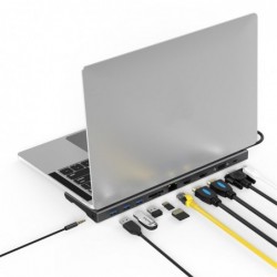 HUB USB por tipo C 9 en 1 3*USB 3.0 Conector tipo C PD para carga Slot para tarjetas Micro SD Slot para tarjetas SD 2 x HDMI (4K hasta 30fps) Para la función de HDMI, el puerto USB-C de su dispositivo debe ser compatible con Display Port o Thunderbolt 3 de lo contrario, el HDMI no funcionará. En caso de que el conector no esté identificado, consulte con el fabricante de su dispositivo, en su web o en el manual de usuario. VGA Full HD Mini Jack 3.5mm LAN RJ45