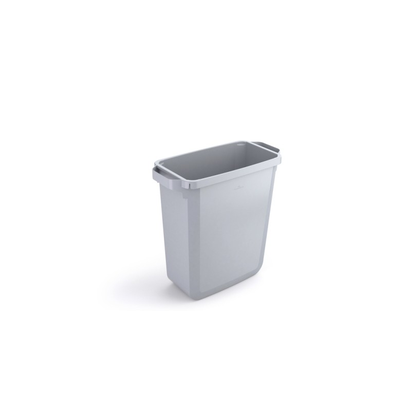 Cubo rectangular de 60 litros. Con asas para un fácil transporte. Ideal para reciclaje y desecho. No apto para guardar alimentos, puede guardarse en un congelador hasta 46°C. Medidas: 615 x 285 x 555 mm (Al x An x P). Características - Cubo de basura y reciclaje, rectangular y de plástico - También se puede usar para almacenar y transportar materias primas en industria y comercio - Con asas para facilitar el transporte - Acanaladuras de sujeción en la base para un vaciado seguro - Con ranuras para enganchar las bolsas de basura - Apto para gestión alimentaria en todos los colores (según el Reglamento (UE) n.º 1935/2004/CE) - Tapa a juego en distintos colores y modelos disponibles por separado - Capacidad: 60 litros Especificaciones Detalles técnicos capacidad total: 60 L Color del producto: Gris Cantidad: 1 Peso y dimensiones Ancho: 600 mm Profundidad: 282 mm Altura: 590 mm