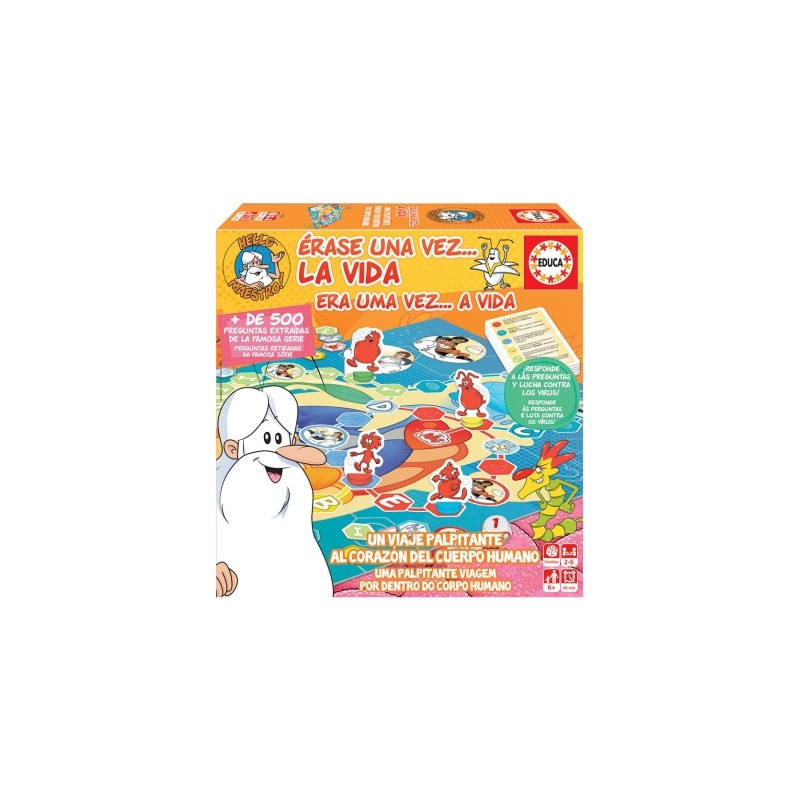 ¡Un gran viaje por el cuerpo humano en compañía de los personajes de la serie Érase una vez… La Vida! Tira el dado y responde las preguntas correspondientes al espacio donde has caído. Si aciertas gana una ficha del Sistema correspondiente a este tema. 5 temas: sangre y circulación, el sistema nervioso y los sentidos, respiración, digestión y órganos, huesos y músculos.Atención. Si el dado cae sobre la cara del Virus, cualquier jugador tendrá que usar una de las fichas recogidas para evitar que Virus entre en el tablero y bloquee el paso. Características - Érase una vez… - Educativo Juego de mesa - Multiplayer Juego familiar - Número mínimo de jugadores: 2 Número máximo de jugadores: 6 - Grupo de edad recomendada: Niño - Género: Cualquier género - Edad recomendada (mín.): 6 año(s) Especificaciones Características Tipo de producto: Juego de mesa Género: Educativo Número mínimo de jugadores: 2 Número máximo de jugadores: 6 Grupo de edad recomendada: Niño Género: Cualquier género Edad recomendada (mín.): 6 año(s) Nombre del Juego: Érase una vez… Modos de juego: Multiplayer Juego familiar: Si Tiempo de juego (máx.): 45 min Número de cartas: 96 pieza(s) Apto para uso en interior: Si Color del producto: Multicolor Contenido del embalaje Tablero de Juego incluido: Si Contenido del paquete: 1 tablero de juego 1 dado 96 cartas 6 fichas de Glóbulo Rojo 60 fichas de Sistema 10 fichas de Virus 10 fichas de Anticuerpo
