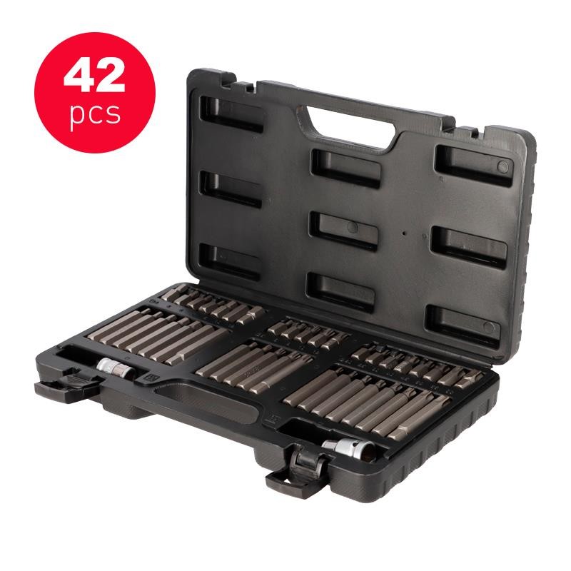 • Maletín con 42 pcs puntas hexagonales, 12 cantos y TORX.• Adaptador cabezales hex de 3/8" para broca 10 mm.• Adaptador de 1/2" para cabezales de 10 mm.• Brocas Hexagonales: 10x75 mm largo: puntas 4, 5, 6, 7, 8, 10, 12 mm / 10x30 mm: puntas 4, 5, 6, 7, 8, 10, 12 mm.• Brocas Torx: 10x30 mm: puntas T20, T25, T30, T40, T45, T50, T55, T60 / 10x75 mm largo: puntas T20, T25, T30, T40, T45, T50, T55, T60.• Brocas XZN: 10x30 mm: puntas 5, 6, 8, 10, 12 mm / 10x75 mm largo: puntas 5, 6, 8, 10, 12 mm.