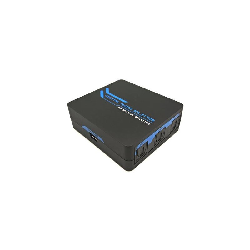 Distribuidor de audio digital, una entrada 3 salidas SPDIF/Toslink Características -1 entrada - 3 salidas - Admite formatos de audio: LPCM2.0 / DTS / Dolby-AC3 - Admite recalculo - Utiliza cables de fibra óptica, con pérdida inferior a 0,2dB /metro. -Distancia desde cable de salida 40m -Protección contra sobretensión -Sin pérdida de calidad -Instalación en minutos