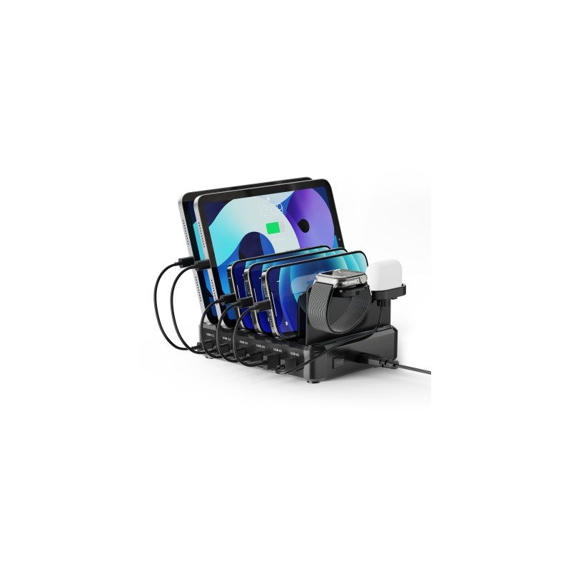 - Cargue teléfonos inteligentes, tabletas, netbooks y computadoras portátiles/Macbooks con USB-C y USB-A. Apto para Apple y Android - Admite carga rápida para iPhone de próxima generación, incluido el iPhone 17 - Admite carga rápida para dispositivos habilitados para Power Delivery (PD 3.0) - 4 puertos USB-C Power Delivery (PD 3.0) y 2 puertos QC 3.0 USB-A - Diseño compacto, IC inteligente incorporado, interruptor de encendido / apagado y luz indicadora LED - Compatible con PD/QC 3.0, PPS, BC1.2 - Dispositivo seguro: equipado con sobrecarga, sobretensión, sobrecorriente, cortocircuito, sobrecarga, control de temperatura (sobrecalentamiento) múltiples protecciones - Equipado con 7 divisores extraíbles para permitir el correcto alojamiento del dispositivo bajo carga - Ideal para cargar su reloj inteligente (Apple iWatch) y auriculares (auriculares, Airpods, Earpods) debido al soporte especial (los cargadores de iWatch y Airpods no están incluidos)