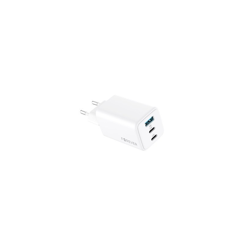 Cargador de pared Forever GaN PD QC TC-08-65ACC, 2 puertos USB-C, 1 puerto USB, 65 W, blanco- Suministro de energía y carga rápida- Tecnología GaN- 2 puertos USB-C + USB-A- Potencia 65 WEl Forever TC-08 es un cargador compacto que, gracias a la innovadora tecnología GaN, garantiza una carga ultrarrápida y eficiente . A pesar de su pequeño tamaño, ofrece potencia total y compatibilidad con los estándares de carga rápida más populares , convirtiéndolo en la solución ideal para quienes valoran la tecnología moderna y la comodidad.El cargador es increíblemente versátil y compatible con una amplia gama de dispositivos. Su diseño minimalista permite guardarlo fácilmente en cualquier bolsillo o bolso, para que siempre lo tengas contigo. Su diseño moderno, basado en la tecnología GaN, permite una carga eficiente y segura , eliminando el calor excesivo y la pérdida de energía.Forever TC-08 es la elección perfecta para cualquiera que espere fiabilidad, máximo rendimiento y soluciones compactas.