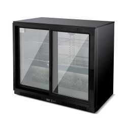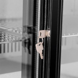 • Dos puertas correderas.• Refrigerado por aire sin escarcha.• Exterior pintado de negro, tablero interior de aluminio.• Las puertas de cierre automático cuentan con juntas magnéticas para un sellado hermético, se pueden bloquear para evitar robos y manipulaciones. • Puerta de cristal doble, esto permite a los clientes ver rápidamente qué bebidas se sirven y permite a los camareros comprobar el stock de un vistazo sin abrir las puertas.• Cuatro estantes cromados ajustables que permiten organizar fácilmente las bebidas.