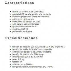 Fuente alimentación laboratorio 0/30V 0/20A LCD
