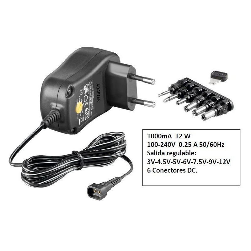 Fuente universal 1000mA 12W salida seleccionable 3V-4.5V-5V-6V-7.5V-9V-12VDC y seis conectores DC modelo US100