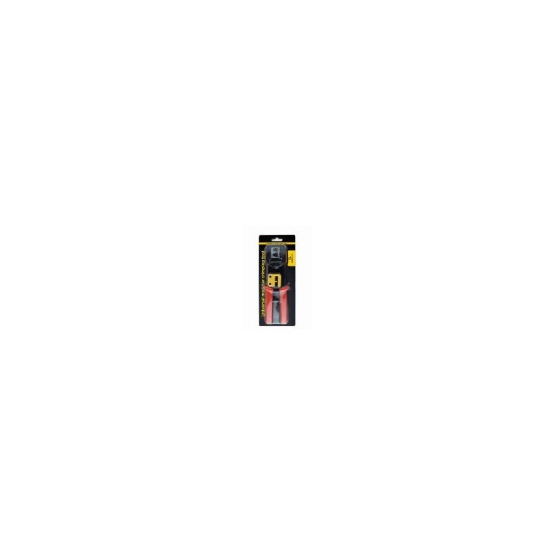 Herramienta de prensa modular universal con función de corte Engarza y corta cables extendidos en un solo movimiento Compatible con la mayoría de los conectores de paso modulares También es adecuado para todos los enchufes modulares estándar 8P8C, 6P6C, 6P4C Cortador y pelador integrados para cable plano y redondo. Especificaciones Materiales: ABS + acero al carbono Enchufes de crimpado: 8P8C / RJ-45, 6P6C / RJ-12, 6P4C / RJ-11 Compatible con: conectores de paso LC-PTU-XX y LC-PT-XX Dimensiones: 195 x 53 x 15 mm Peso neto: 360 g https://www.gembird.com/item.aspx?id=11358