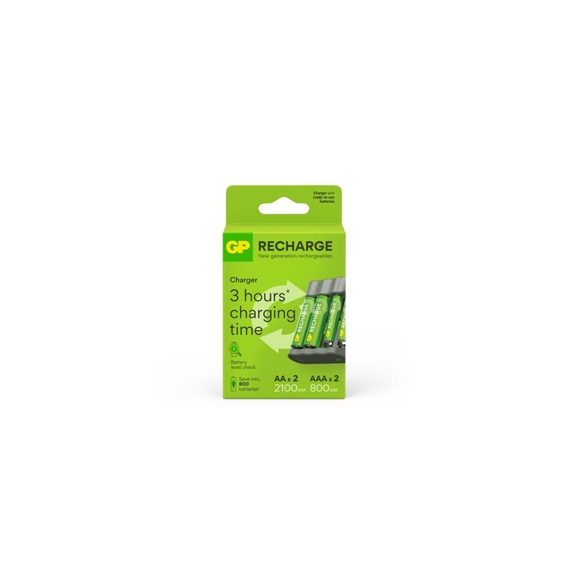 GP Cargador de Pilas AA/AAA Con Pack 2 Pilas AA 2100Mah + 2 Pilas AAA 800mAh Recargables