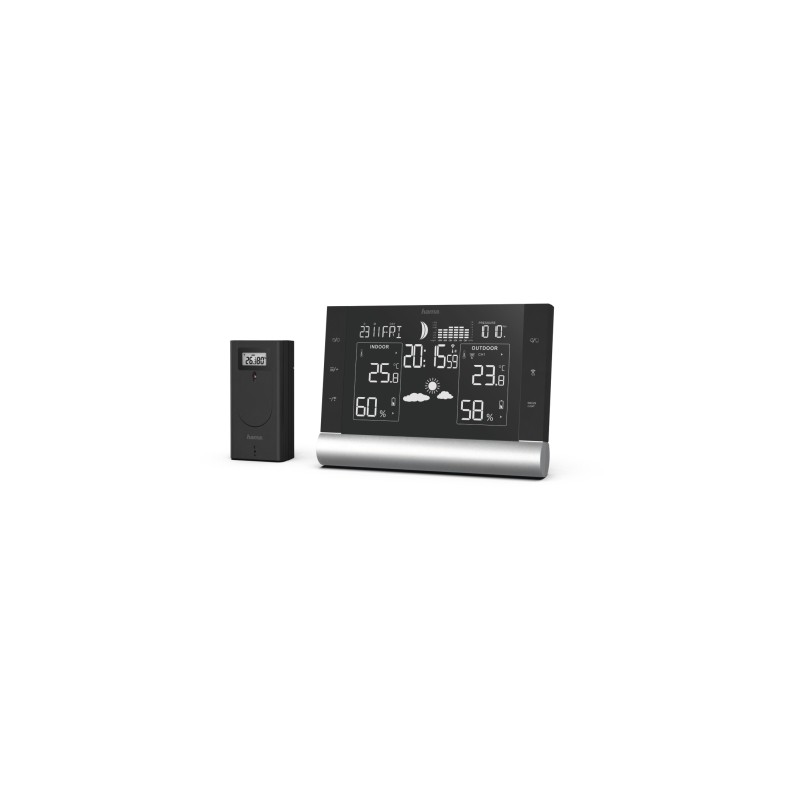 - Color: Negro - Tipo de clavija del conector de alimentación: Euroconector, tipo C (CEE 7/16) - Transmisión de la Señal: Radio - Alcance del sensor exterior por radio: 50 m - Sensor exterior de la pantalla: Higrómetro, Termómetro - Funciones Adicionales Advertencia de moho, Alarma de heladas, Función de Alarma, Función de Repetición de alarma, Indicador de capacidad de la baterÃa Sensor exterior, Indicador de la capacidad de la baterÃa, Memoria de datos, Muestra los valores máximos y mÃnimos, Posibilidad de ampliación, Previsión Meteorológica, Punto de rocÃo, Reloj DCF-Radio, Sensor exterior, Temperatura, Visualización de las fases lunares, visualización de la tendencia de la humedad del aire, visualización de la tendencia de la presión atmosférica, Ãndice de calor - Higrómetro exterior: 20-95% - Higrómetro Interior: 20-95% - Modo de Funcionamiento: Radio - Montaje: Se mantiene de pie, Se puede colgar - Pantalla: Digital - Precisión de la humedad: ±8% - Precisión de la presión atmosférica: ±5hPa - Precisión de la temperatura (interior y exterior): ±2°C - Rango de medición de la humedad: 20% to 95% - Rango de medición de la presión atmosférica: De 850hpa a 1050hpa - Rango de medición de la temperatura: Exterior-20°C a +60°C/Interior: 0°C hasta +50°C (32°F hasta 122°F) ° - Resolución de la humedad: 1 % - Resolución de la presión atmosférica: 1 hpa - Resolución de la temperatura: 0,1 ° - Temperature Accuracy (Indoor): ±1°C - Ancho x Produndo x Alto: 17.5 x 2,2 x 12.3 cm - Número de BaterÃas del Sensor Exterior: 2 - Tipo de BaterÃa del Sensor Exterior: AA Mignon