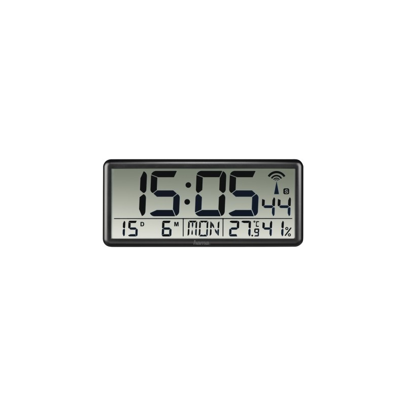 Características - Color de la Carcasa: Negro - Seconds display: Display Screen - Cover material: Plástico - Funciones Adicionales: Base, DCF can be switched off, Fecha, Hygrometer (20% bis 95%), Reloj DCF-Radio, Thermometer (+0°C to +50°C), Time zone setting - Material del cuerpo: Plástico - Modelo: Table Clock, Wall Clock - Modo de Funcionamiento: Radio - Pantalla: Digital - Altura: 16 cm - Ancho: 36 cm - Peso: 650 g - Profundidad: 3 cm - Número de Baterías: 4 - Tipo de Batería: AA Mignon Especificaciones Características Colocación soportada: Pared Tipo: Reloj digital Factor de forma: Rectángulo Color del producto: Negro Material del marco: Plástico Rango de medición de temperatura: 0 - 50 °C Rango de medición de humedad: 20 - 95% Calendario: Si Termómetro: Si Higrómetro: Si Control de energía Alimentación: Batería Tipo de batería: AA Mignon Numero de baterías soportadas: 4 Voltaje de la pila: 1,5 V Peso y dimensiones Ancho: 360 mm Profundidad: 30 mm Altura: 160 mm Peso: 650 g Contenido del embalaje Pilas incluidas: Si