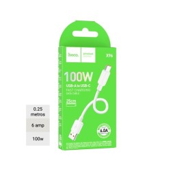 Cable USB a USB-C 0.25 metros 100w Hoco X96 BlancoReferencia 4040301110Hoco X96 Cable Hyper de 100W de Usb Tipo-A a Usb Tipo-C de 0.25 metros color BlancoDescubre el Cable USB Hyper X96, una solución ideal para tus necesidades de conexión. Este cable combina calidad y funcionalidad, permitiéndote transferir datos y cargar dispositivos de manera eficiente. A continuación, te presentamos todas sus características y especificaciones.Características PrincipalesCaracterística ValorTipo de Cable Cable USBModelo Hyper X96Código UT-00014101Strychcode 6942007609432Color BlancoMaterial Cloruro de polivinilo (PVC)Longitud del cable 25 cmConector 1 USBConector 2 Tipo-CCorriente de carga 6APotencia del cable 100WBeneficios del Cable USB Hyper X96Con el cable USB Hyper X96, disfrutarás de una conexión rápida y segura para todos tus dispositivos. Su diseño robusto y material de PVC garantizan durabilidad y resistencia, mientras que su longitud de 25 cm lo hace perfecto para usar en cualquier entorno, ya sea en casa, en la oficina o mientras viajas.Ideal para Todos Tus DispositivosEste cable es compatible con una amplia variedad de dispositivos, incluyendo smartphones, tablets y otros gadgets que utilicen conexiones USB y Tipo-C. Ya sea que necesites transferir datos o cargar tu dispositivo, el Cable USB Hyper X96 es la solución perfecta.