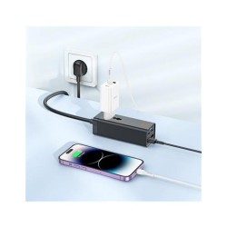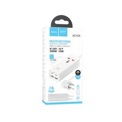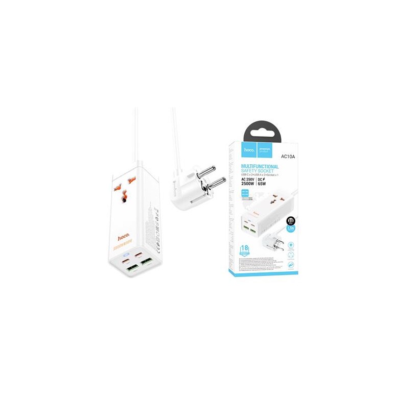 CARGADOR USB Y USB-C 65W ENTRADA MULTIPAÍS HOCO AC10A BLANCOReferencia 4040300887HOCO AC10A Barry PD65W(2C2A con 1 enchufe) cargador de sobremesa(EU)El cargador de sobremesa HOCO AC10A Barry PD65W(2C2A con 1 enchufe) es la solución perfecta para cargar tus dispositivos de manera eficiente y segura. Con su diseño compacto y elegante, este cargador es ideal para uso doméstico o de viaje.Material y dimensionesEl cargador está fabricado con material PC ignífugo, lo que garantiza la máxima seguridad durante su uso. Con unas dimensiones de 117*43*39mm, este cargador es compacto y fácil de transportar. Además, su longitud de línea de 1.5m y un peso total de 342g lo hacen muy conveniente para su uso diario.Características de salidaSalida AC: 10A/250VSalida USB:Tipo-C 1/2: 65W (PD/PPS/QC/FCP/AFC)USB-A 1/2: 18W (QC/FCP/AFC)C1+C2=45W+20WA1+A2=5V/3AC1+A1/A2=45W+18WC1+(A1+A2)=45W+15WC2+A1+A2=5V/3AC1+(C2+A1+A2)=45W+15WDiseño y colores disponiblesEl cargador de sobremesa HOCO AC10A Barry PD65W(2C2A con 1 enchufe) está disponible en dos colores: negro y blanco. Su diseño elegante y minimalista se adapta a cualquier entorno y estilo.