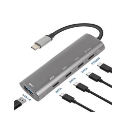 FGNS.HUB 5 en 1 ,USB-C A 4 USB-C+ 1 USB 3.0,TCV010Ref.: TCV010HUB USB-C A PD HUB 5 en 1: 1 USB 3.0, 3 interfaces de transmisión de datos tipo C y 1 entrada de carga tipo C PD60W.El producto no admite la función de salida de carga, pero solo admite la entrada de cargaTransferencia de datos de 10 Gbps: USB HUB está equipado con 3puertos USB C, lo que te permite hacer copiasde seguridad fácilmente de archivos desde dispositivos externos, transferir imágenes, etc., con una velocidad detransferencia de hasta 10 Gbps. 1 puerto USB 3.0 con una velocidad de transferencia de hasta 5 Gbps. Adecuadopara portátiles, teléfonos móviles, tabletas y otros dispositivos con USB tipo C.Nota: USB C Hub solo soportatransmisión de datos, no carga, transmisión de video y otras funciones4 puertos USB C: Adaptador USB C de 4 puertos USB-C macho puede convertir un puerto USB C macho en tucomputadora en 4 puertos de transferencia de datos USB C. Permite que tu portátil conecte más dispositivosexternos tipo C, como discos duros, discos U, ratones, etc. Nota: USB C Hub solo soporta transmisión de datosDiseño portátil: Pequeño tamaño 98x30x14mm/3,85x1,18x0,55 pulgadas Longitud del cable150mm/5,9 pulgadas,el usb c a usb c hub es compacto y pesa solo 0.25 libras, lo que es muy adecuado para su uso en viajes, hogar y oficina,y es fácil de llevar. Además, el concentrador USB C no necesita instalar controladores, Plug and Play, lo que es conveniente para convertir entre diferentes computadoras. Uso: carcasa de aluminio para una disipación eficiente del calorAmplia compatibilidad: El HUB USB-C A PD HUB 5 en 1 es adecuado para todos los dispositivos con puertos USB C.Como MacBook Pro 16 pulgadas, MacBook Pro/Air, iMac 2021/2019/2017, iPad Pro, Microsoft Surface Laptop 3/Surface Pro 8/GB, Google Pixel.elBook Go, Chromebook, Samsung Galaxy Tab Pro S, HP Spectre Convertible, Razer Blade, Huawei Matebook,etc. Si no está seguro de los problemas de compatibilidad con su dispositivo, puede contactarnos, haremos nuestro mejorpara ayudarle a dudar de las respuestas.Notas antes del uso: 1. El concentrador USB solo admite la función de transmisión de datos, no carga ni conexión de pantalla. 2. Debe usar cables que admitan una velocidad de transmisión de 10 Gbps, y la velocidad de transmisión puede alcanzar los 10 Gbps. 3. Se recomienda utilizar uno o dos discos duros externos para obtener la mejor experiencia