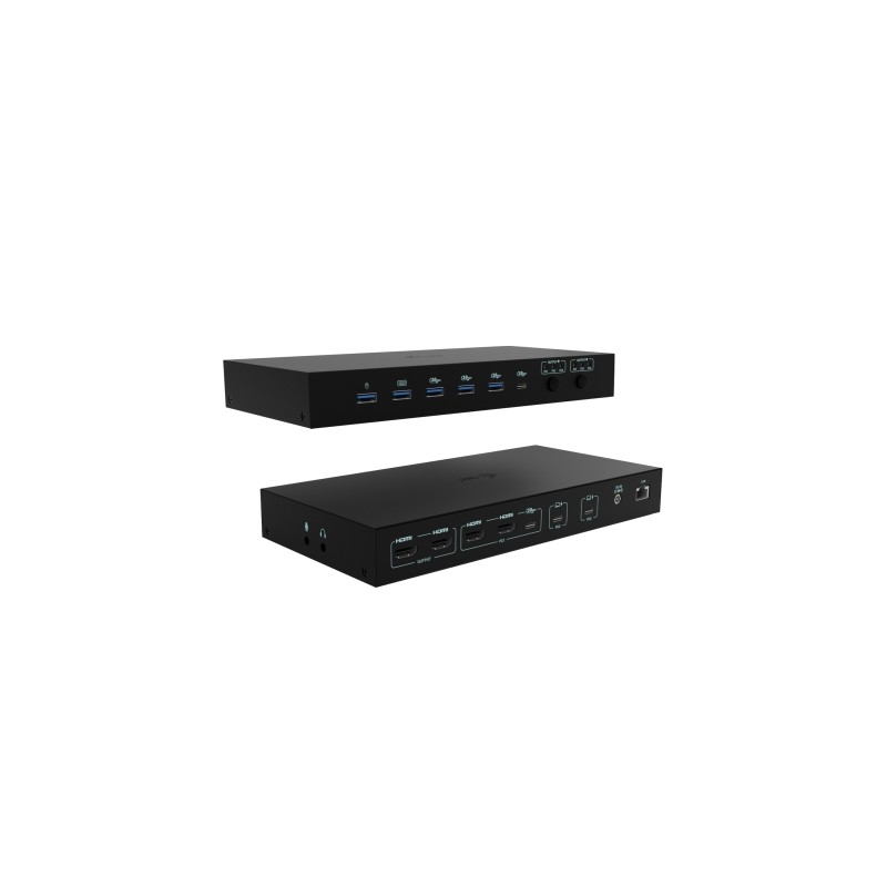 Estación de acoplamiento KVM premium para hasta tres dispositivosEsta estación de acoplamiento de alto rendimiento permite conectar simultáneamente hasta tres dispositivos host: un PC o una consola de videojuegos y dos portátiles o tabletas. Totalmente compatible con dispositivos que cuentan con puertos USB-C, USB4 o Thunderbolt 3/4/5. Los PC o las consolas se pueden conectar a través de HDMI y USB.Admite hasta dos monitores externos, que pueden mostrar contenido de un solo host o de uno diferente cada uno, lo que resulta ideal para realizar múltiples tareas o trabajar en varios sistemas.Gracias a los dos puertos USB itinerantes, puede compartir sin problemas el teclado y el ratón entre dos hosts a la vez, lo que aumenta la comodidad y la productividad.La estación también cuenta con cuatro puertos USB de alta velocidad (10 Gbps) para tus periféricos, además de conectividad completa, incluyendo puertos GLAN, audio y micrófono.La alimentación inteligente admite una carga de hasta 92 W para un solo portátil, o 65 W cada uno cuando se alimentan dos dispositivos simultáneamente.Con los prácticos selectores de salida, puedes elegir fácilmente si ambos monitores reflejan un único host o funcionan de forma independiente en dos, lo que resulta ideal para flujos de trabajo paralelos.- Compatible con hasta 3 dispositivos host externos (2 portátiles/tabletas y 1 consola de juegos/PC)- Conecta hasta 2 monitores externos con una resolución de hasta 4K/60 Hz *- 2 puertos USB inteligentes para teclado y ratón con función de itinerancia (compartida)- 4 puertos USB rápidos con velocidad de 10 Gbps (3 USB-A y 1 USB-C, que también pueden cargar hasta 15 W)- Puerto LAN con velocidades de hasta 1 Gbps (10/100/1000 Mbit)- 2 puertos de 3,5 mm para audio y micrófono- Fuente de alimentación 1x 92 W o 2x 65 W- 2 botones OUTPUT independientes para seleccionar el dispositivo host (el botón OUTPUT 1 también sirve como interruptor de encendido de la estación de acoplamiento)* macOS no es compatible con Multi-Stream Transport (MST) para la salida de vídeo en varias pantallas. Como resultado, cuando se utiliza macOS, la misma imagen se reflejará en ambos monitores conectados.